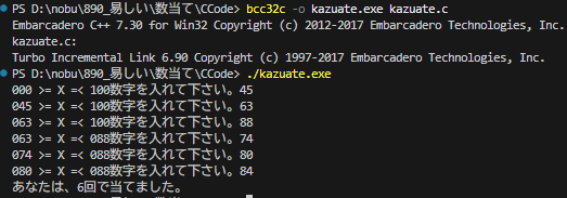 コンピュータが考えている数値を当てて下さい。できるだけ回数少なく当てましょう。
